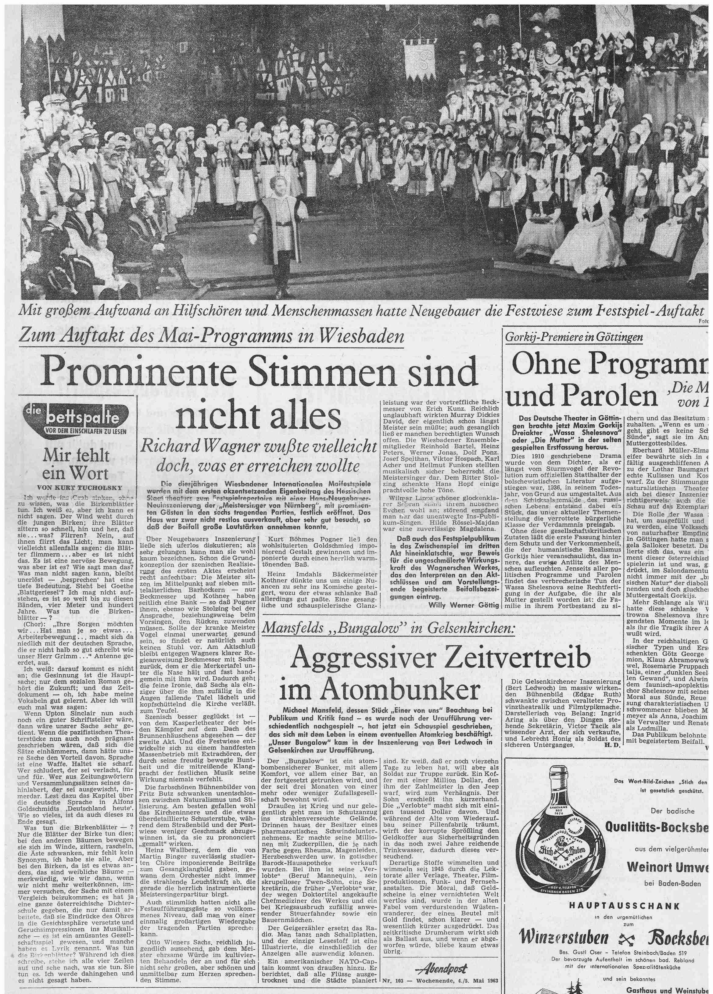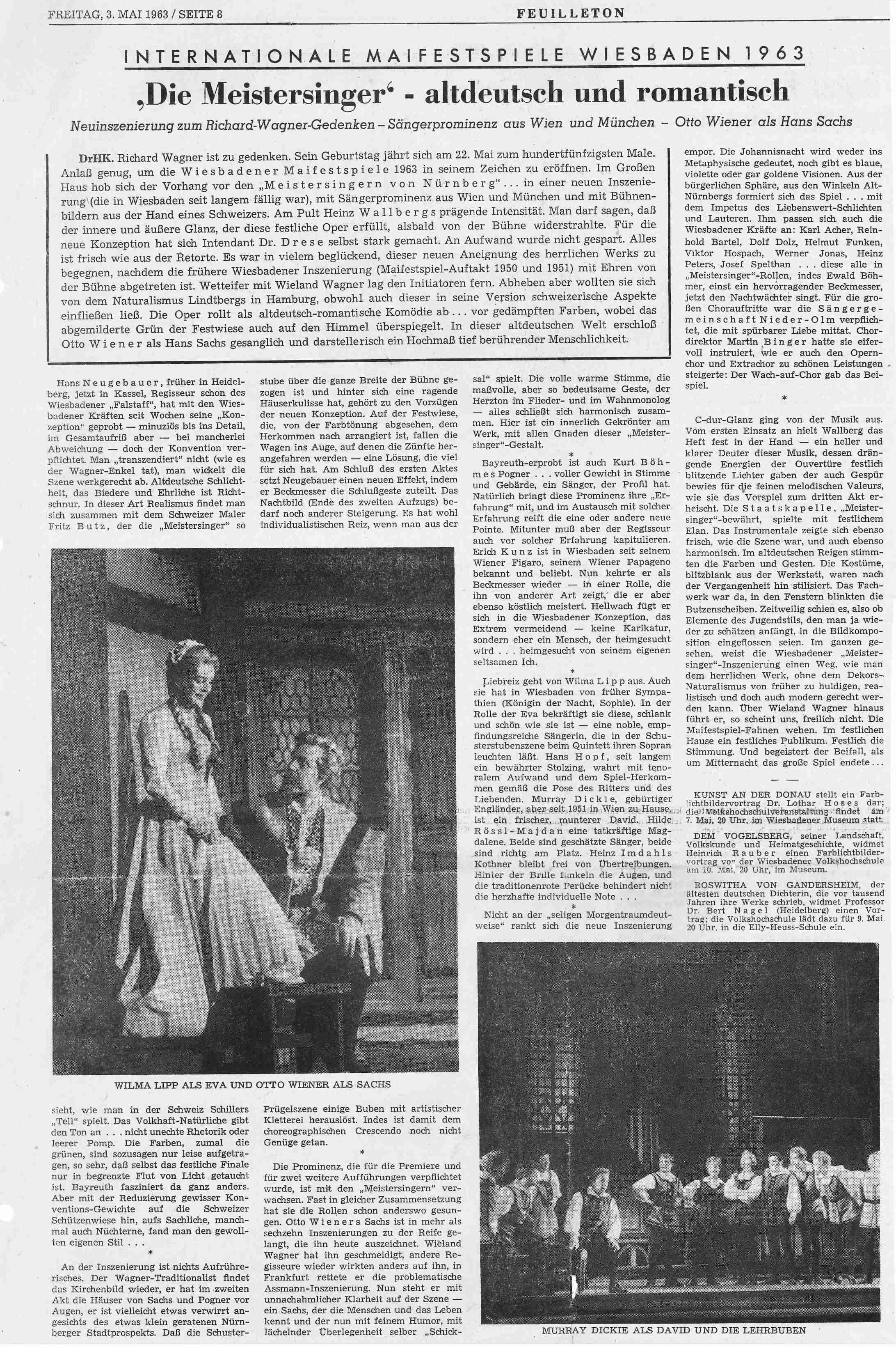 Den Jubiläumsausflug aus dem Jahre 1967 holte man 1968 nach; er führte auf Wunsch der Familie Tegelaar nach Holland. Auftritt des Chores im Staatstheater in Wiesbaden bei der Aufführung "Die Meistersinger'. Die Beteiligung der Chormitglieder hätte etwas besser sein dürfen; dies beklagte der Dirigent bei der Nachlese, obwohl es trotz allem ein großer Erfolg war. |