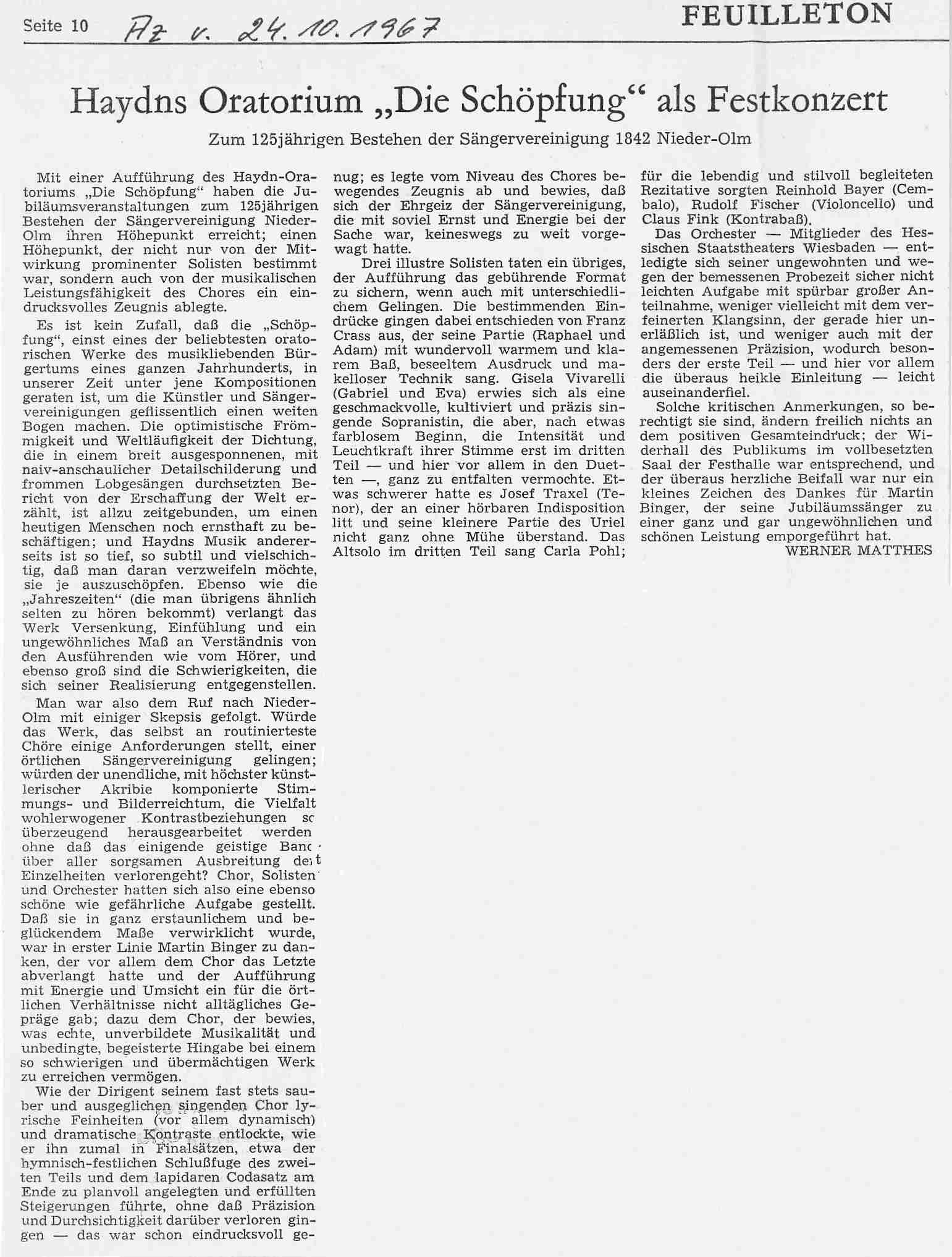 im Jubiläumsjahr durchgeführt: Teilnahme, auf Einladung der Gemeindeverwaltung, an den Partnerschaftsfeierlichkeiten zwischen Nieder-Olm und Recey-sur-Ource vom 8. bis 10. Juli 1967 in Frankreich. Der Chor übernahm dort als Botschafter des Gesangs den musikalischen Teil der Feiern in der Kirche, auf dem Rathausplatz sowie auf der Festwiese. Seitdem verbindet uns eine herzliche Freundschaft mit der damaligen Bürgermeisterin von Recey-sur-Ource, Frau Parisot, die auch Ehrenmitglied der Sängervereinigung ist.