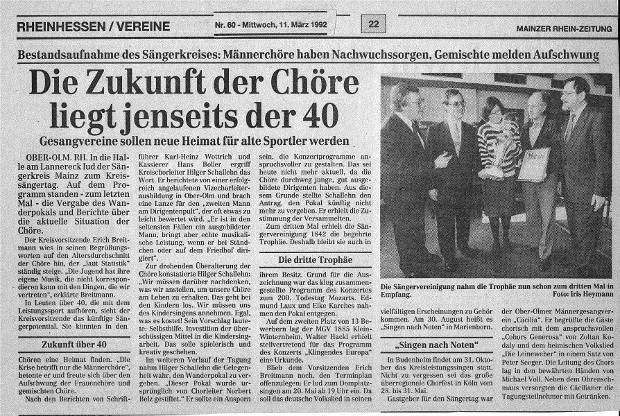 150 Jahre Sängervereinigung 1842 Nieder-Olm e.V. Bei der Tagung des Sängerkreises Mainz am 08.03.1992 in
