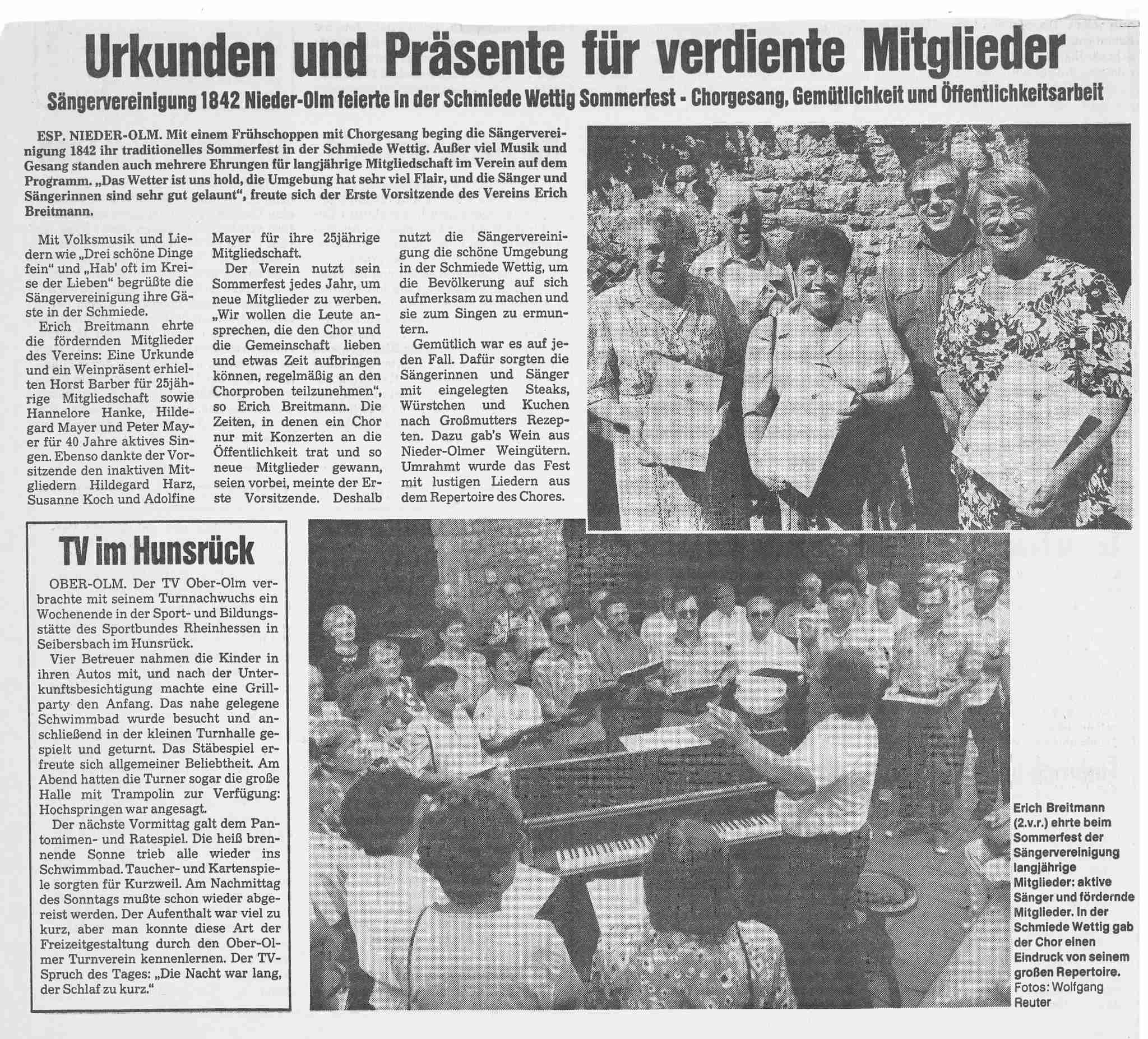 Erich Breitmann eingeladen. Am 01.05. war wieder die jährliche Chorwanderung. Es war eine Mühlenwanderung in Nieder-Olm. Der Abschluß fand beim fördernden Mitglied Josef Becker (Andreashof) statt. Am 04.05. nahmen wir am Freundschaftssingen des MGV 1861 Elsheim e.V., anläßlich des 135-jährigen Jubiläums", in der Selztalhalle in Stadecken-Elsheim teil. Für alle aktiven Teilnehmer gab es eine Flasche Wein als Gastgeschenk. Das Nieder-Olmer Straßenfest fand vom 07.06. bis 09.06.